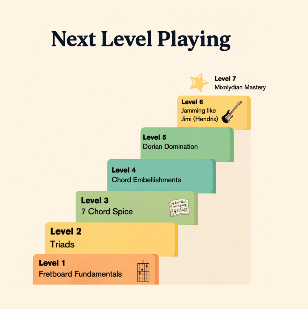 I designed this course to give busy guitarists a clear practice roadmap so they know exactly what to work on, every time they sit down to play.